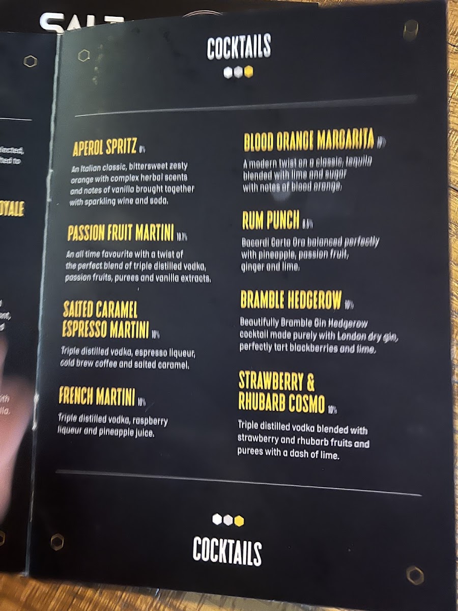The cocktail menu is equally tantalizing, with favorites like the Salted Caramel Espresso Martini and Aperol Spritz on tap, ensuring a refreshing treat. Pair these with delicious baked goods, like the generously portioned cinnamon swirl, to enhance your visit. With a lively atmosphere, friendly staff, and an outstanding range of beverages, SALT Leeds City is a must-visit destination that guarantees great memories and even better drinks.